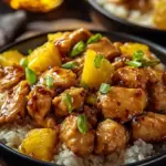 Ein köstliches Gericht, das zartes Hähnchenfleisch mit süßen Ananasstücken und Sojasauce kombiniert – ein tropisches Geschmackserlebnis.
