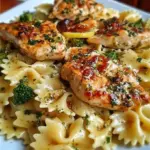 Ein köstliches Hühnchengericht mit knuspriger Kruste, frischem Zitronensaft und würzigem Knoblauch, das wunderbar harmoniert mit Bowtie-Pasta.