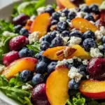 Ein erfrischender Salat mit saftigen Pfirsichen, süßen Blaubeeren und cremigem Feta-Käse, perfekt für den Sommer.