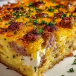 Mischung vorbereiten: In einer großen Rührschüssel vermengen Sie die gebratene Wurst, gefrorene Kartoffel Rösti, Frischkäse, Milch und die Hälfte des geriebenen Cheddars. Mischen Sie alles gründlich, bis eine homogene Masse entsteht.