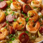 Ein köstliches Pfannengericht mit würziger Wurst, zarten Garnelen und geschmortem Kohl, perfekt für gemütliche Abendessen.