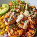 Eine erfrischende Gegrillte Garnelen-Schüssel mit zarten Garnelen, knackiger Mais-Salsa und cremiger Knoblauchsoße für ein sommerliches Erlebnis.