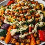 Geröstetes Gemüse mit Kichererbsen und Tahini-Dressing ist mehr als nur eine einfache Mahlzeit – es ist ein Fest der Aromen und Texturen, das jeden an den Tisch zieht. Es überrascht nicht, dass dieses Gericht sowohl nährstoffreich als auch unglaublich schmackhaft ist. Es ist ein perfektes Beispiel dafür, wie einfache Zutaten in ein magisches Erlebnis verwandelt werden können.