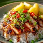 Ein köstliches Gericht mit zartem Hähnchen in einer süßen Marinade aus Ananas und Soja, serviert mit cremigem Kokosreis.