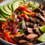 Eine köstliche Fajita-Schüssel mit saftigem Steak, buntem Gemüse und cremiger Avocado, perfekt für ein nahrhaftes Abendessen.
