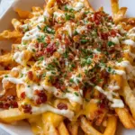 Die Pommes frites selbst sind goldbraun und knusprig, knacken verführerisch, wenn Sie sie anheben und genießen. Darauf liegt eine reichhaltige, geschmolzene Käsesauce, die beim ersten Bissen auf der Zunge schmilzt und ein unglaublich cremiges Gefühl hinterlässt. Die kräftigen Aromen von selbstgemachter Soße und frisch zubereitetem Speck umarmen jeden Bissen, während die knackigen Frühlingszwiebeln eine frische Note hinzufügen. Nach einigen Bissen spüren Sie eine heitere Wärme, hervorgerufen durch eine sorgfältige Auswahl von Gewürzen, die Ihrer Geschmacksknospen mit einer Freudenbotschaft belohnen.