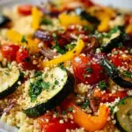 Servieren: Verteile den warmen Röstgemüse Couscous auf Tellern und genieße jeden köstlichen Bissen!