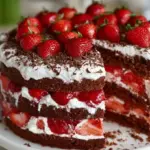 Eine exquisite Schwarzwälder Erdbeertorte mit zartem Biskuit, cremiger Sahne und frischen Erdbeeren – perfekt für Sommerfeiern.