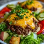 Anrichten: Beginne mit einer Schicht der knusprigen Kartoffeln in einer Schüssel, darauf folgt das Rinderhackfleisch, die karamellisierten Zwiebeln und die geschmolzene Käseschicht. Träufle die Sauce darüber und garniere das Ganze mit frisch gehacktem Salat und Petersilie. Serviere sofort – es ist Zeit, zu genießen!