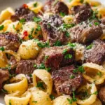Stellen Sie sich vor, Sie setzen sich an einen festlich gedeckten Tisch, während der Duft von gebratenem Steak und geröstetem Knoblauch den Raum erfüllt. Das zarte Fleisch, perfekt gewürzt und goldbraun angebraten, vereint sich mit der Geschmeidigkeit einer cremigen Alfredo-Sauce, die über die großzügigen Muschelpasta gleitet. Jedes Stück Pasta umhüllt die geschmackvolle Knoblauchbuttersoße, während die Frische der Petersilie einen Hauch von Farbe und ein belebendes Aroma hinzufügt. Dieses Gericht ist nicht nur eine amouröse Liebeserklärung an die italienische Küche. Es ist ein Fest für die Sinne.